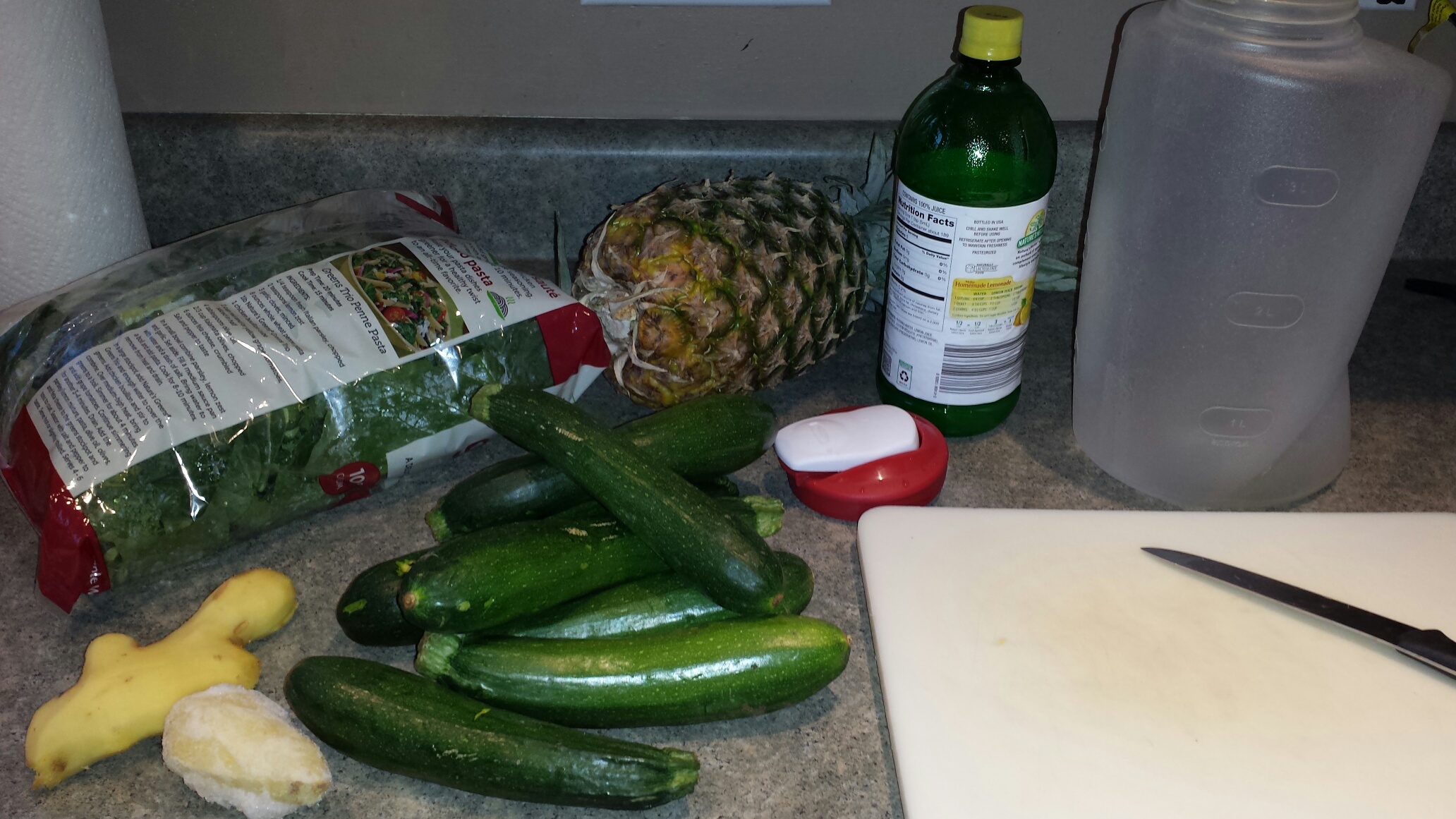 You will need a blender, a cutting board, sharp knife, and an empty gallon container.  For the first six months making Poo Juice, I used a rinsed out Apple Juice gallon jug.  Oh yeah, and all these ingredients…..20150223_174055