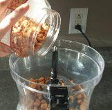 First, pour peanuts into your food processor with the chopping attachment installed. I like to use a little honey-roasted and then finish up with regular salted peanuts. This is completely to taste. Fill your processor about half full.