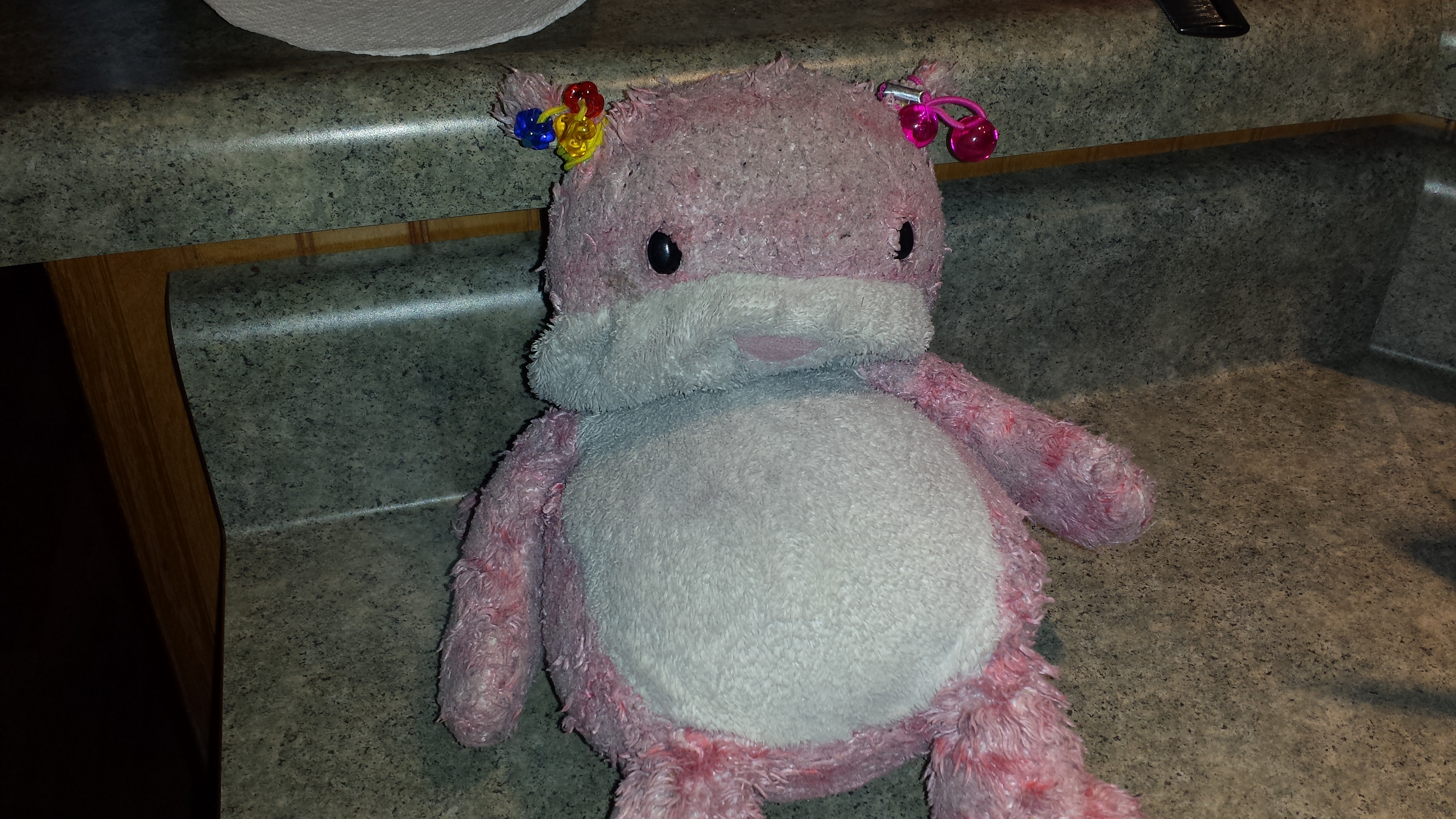 I had to start with Meow to set the mood. Kenzie wanted crazy braids and decided that Meow should have crazy braids too. I tried explaining to Kenz that Meow’s hair was too matted short. Here come the waterworks. Okay, okay… I grabbed that little pink cat, and “braided his hair”.