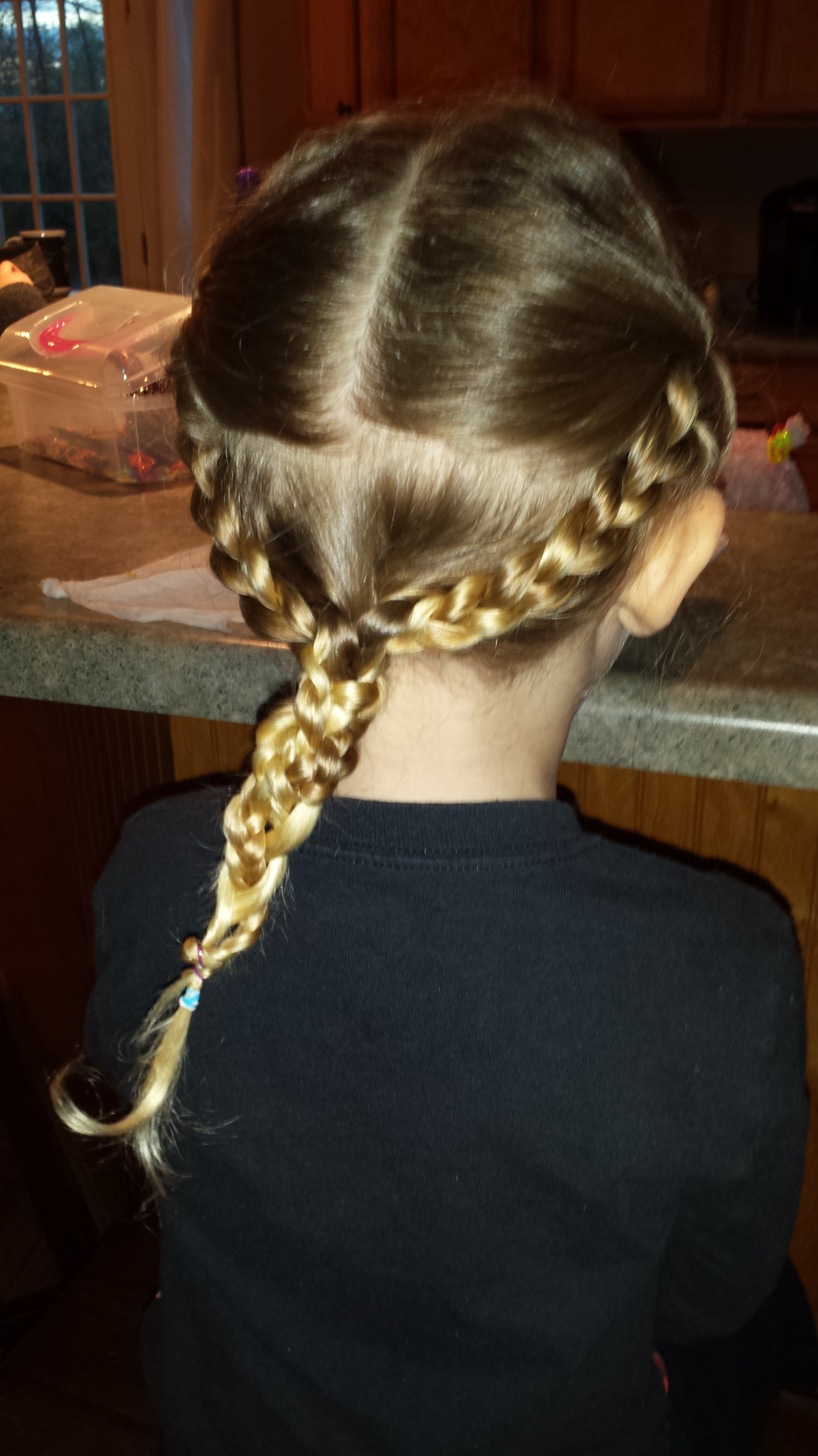 Next, on to the Three-Year Old Beast… How many braids to you want, Sweetie? One. One? That’s it? That isn’t very crazy, MacKenzie. How about two braids, in pigtails? <waterworks again> Okay, okay… Um, how about three braids, that we braid together into one? Yeah? This works for you? There was a lot of squirming, and braiding hair hasn’t really ever been my thing, but here was the final outcome:
