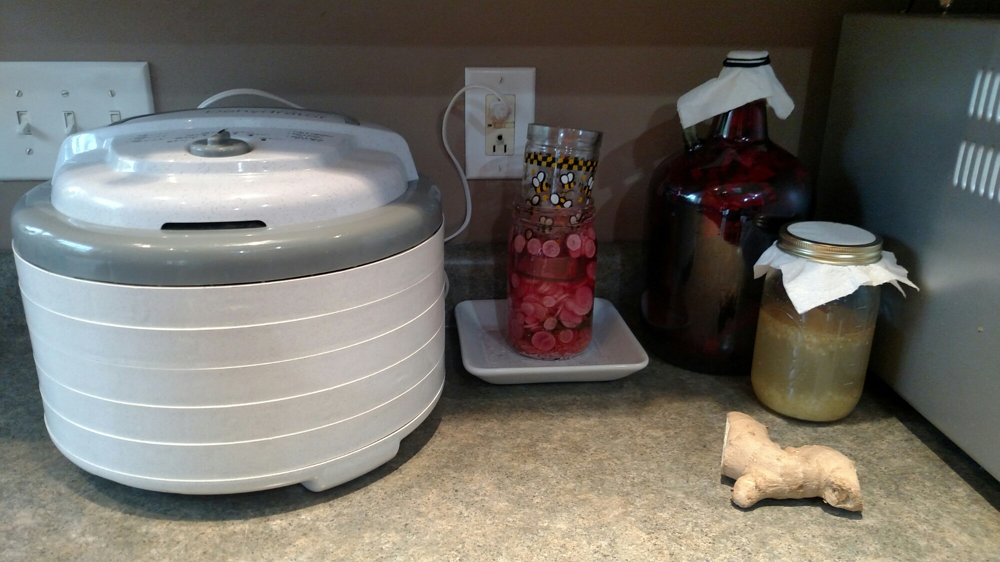 But, it doesn’t stop there! The heat that my dehydrator expels will speed the lactofermintatiom process of my (a) pickled radishes, (b) ginger-beet Kvass, and (c) already bubbling ginger bug!!!