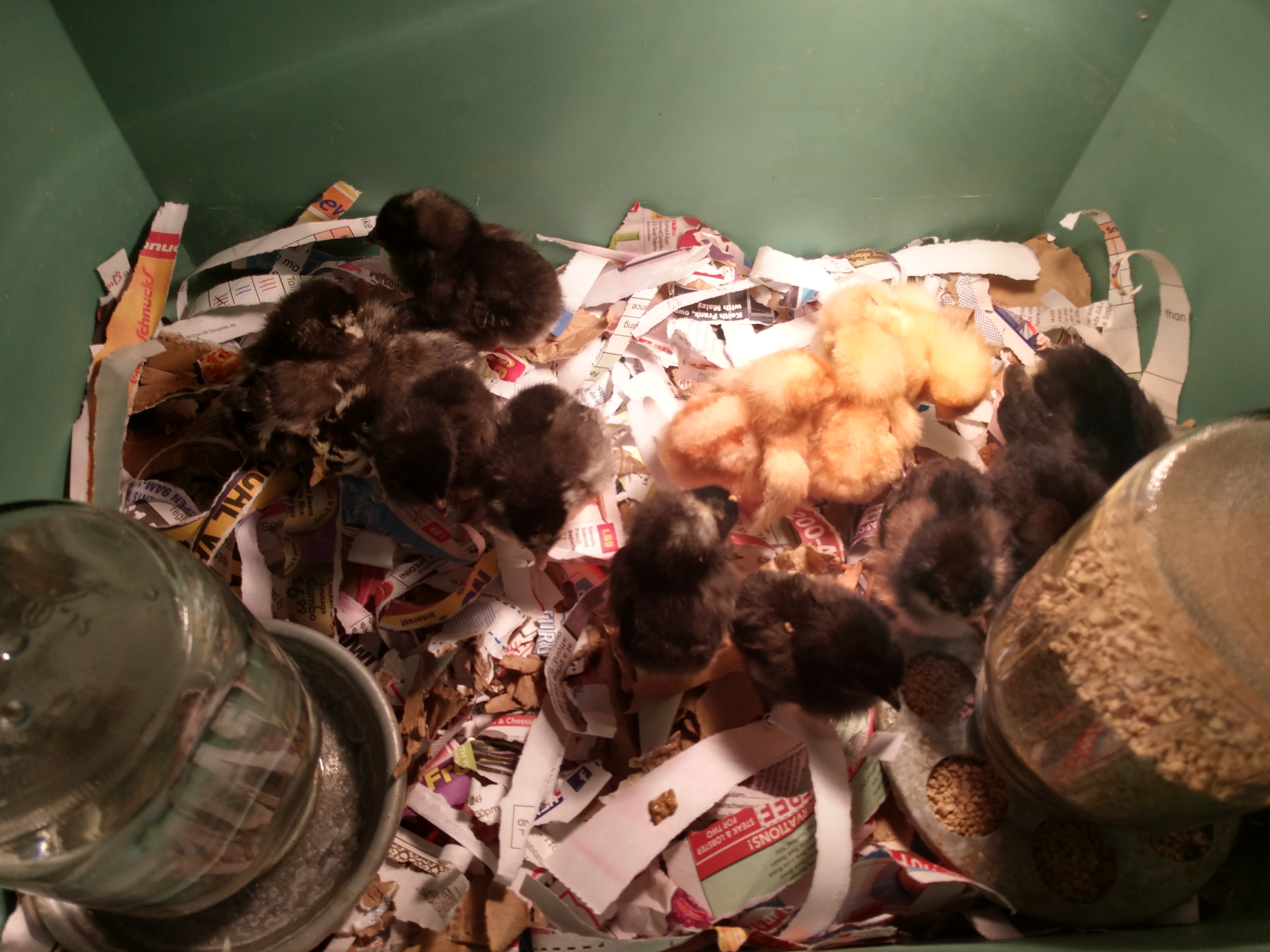 She started chirping softly as I approached the box.  Her eyes were wide and dark, but with a new sense of calm.  Her black and grey down looked like she had just paid a visit to the local salon for a blow-out.  She didn’t squawk when I picked her up and carried her back to her tub with the other girls.  Maybe I am not such a bad chicken mother after all?